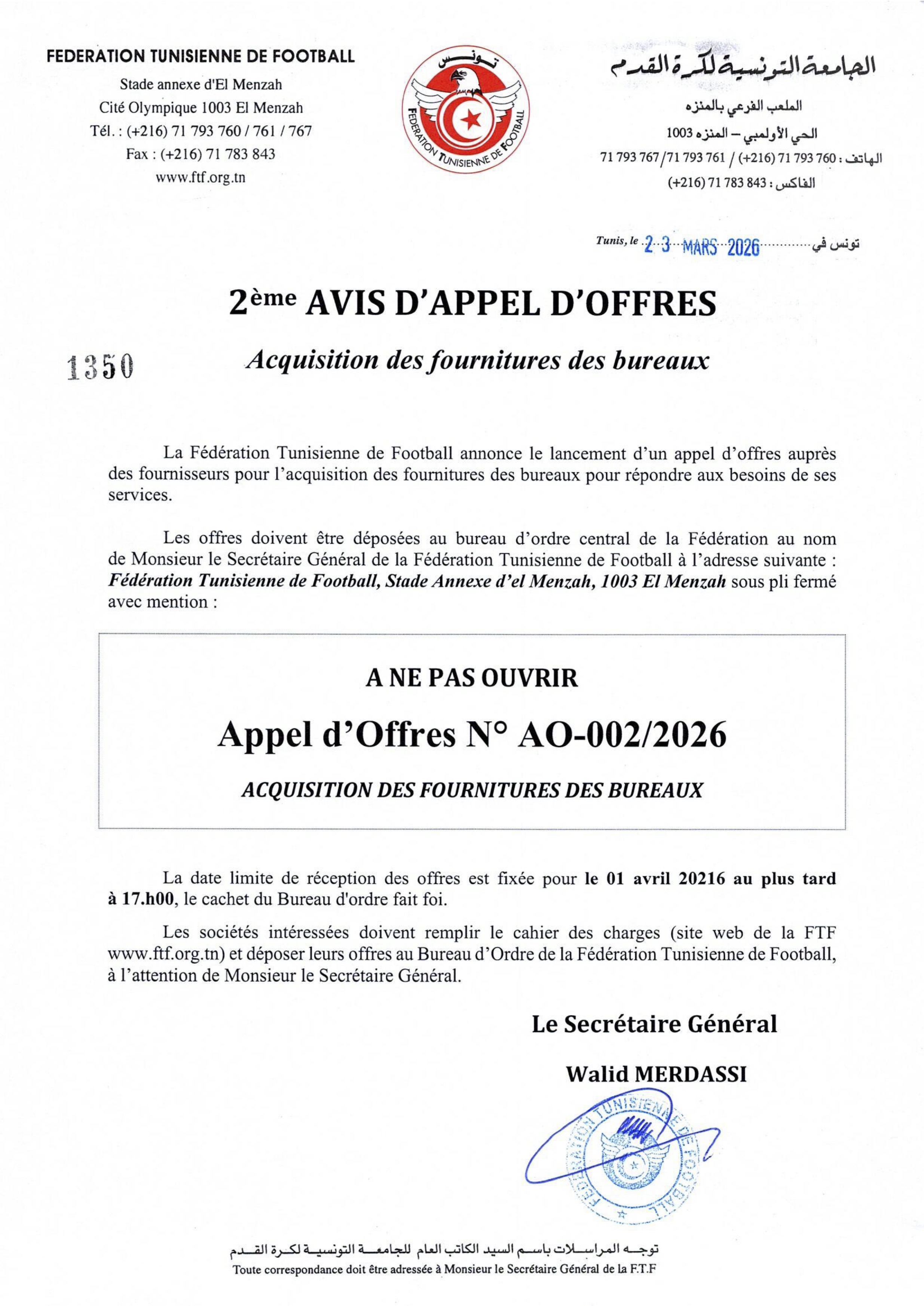 2ème Avis: Acquisition de fournitures de bureau 23 mars 2026 Imprimer Share on Facebook Share Share on TwitterTweet Share on Pinterest Share Share on LinkedIn Share
