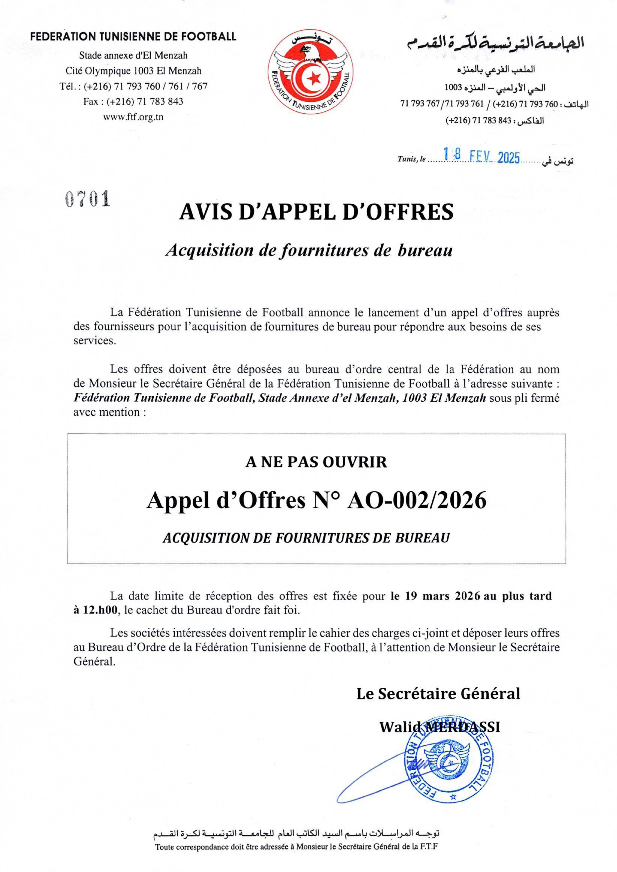 Acquisition de fournitures de bureau 18 février 2026 Imprimer Share on Facebook Share Share on TwitterTweet Share on Pinterest Share Share on LinkedIn Share